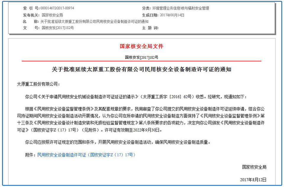 针对核电产品,太重按照国家有关核电的法规规定,建立核电质保体系,取得民用核安全设备制造许可证。